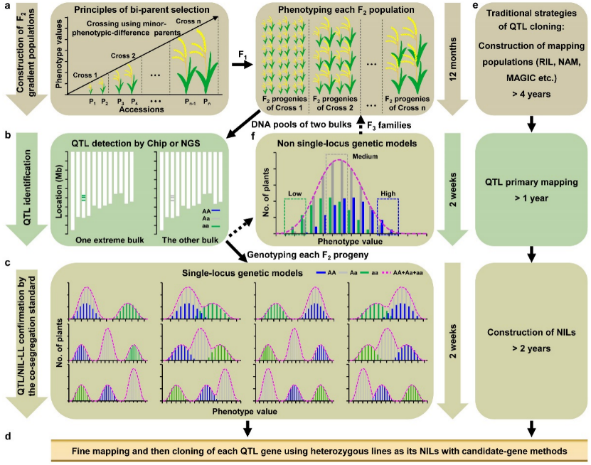 Abstract: Cloning quantitative trait locus (QTL) is time consuming and laborious, which hinders the understanding of natural variation and genetic diversity. Here, we introduce RapMap, a method for rapid multi-QTL mapping by employing F2 gradient populations (F2GPs) constructed by minor-phenotypic-difference accessions. The co-segregation standard of the single-locus genetic models ensures simultaneous integration of a three-in-one framework in RapMap i.e. detecting a real QTL, confirming its effect, and obtaining its near-isogenic line-like line (NIL-LL). We demonstrate the feasibility of RapMap by cloning eight rice grain-size genes using 15 F2GPs in three years. These genes explain a total of 75% of grain shape variation. Allele frequency analysis of these genes using a large germplasm collection reveals directional selection of the slender and long grains in indica rice domestication. In addition, major grain-size genes have been strongly selected during rice domestication. We think application of RapMap in crops will accelerate gene discovery and genomic breeding.