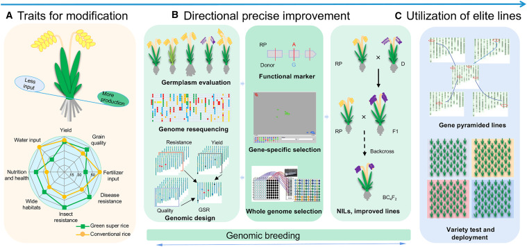 Abstract: Producing sufficient food with finite resources to feed the growing global population while having a smaller impact on the environment has always been a great challenge. Here, we review the concept and practices of Green Super Rice (GSR) that have led to a paradigm shift in goals for crop genetic improvement and models of food production for promoting sustainable agriculture. The momentous achievements and global deliveries of GSR have been fueled by the integration of abundant genetic resources, functional gene discoveries, and innovative breeding techniques with precise gene and whole-genome selection and efficient agronomic management to promote resource-saving, environmentally friendly crop production systems. We also provide perspectives on new horizons in genomic breeding technologies geared toward delivering green and nutritious crop varieties to further enhance the development of green agriculture and better nourish the world population.