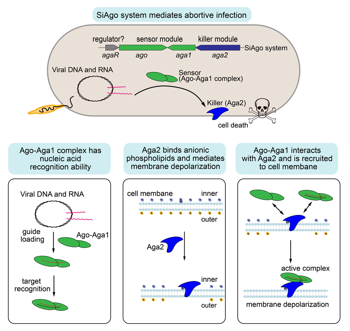 Abstract:Argonaute (Ago) proteins are widespread nucleic-acid-guided enzymes that recognize targets through complementary base pairing. Although, in eukaryotes, Agos are involved in RNA silencing, the functions of prokaryotic Agos (pAgos) remain largely unknown. In particular, a clade of truncated and catalytically inactive pAgos (short pAgos) lacks characterization. Here, we reveal that a short pAgo protein in the archaeon Sulfolobus islandicus, together with its two genetically associated proteins, Aga1 and Aga2, provide robust antiviral protection via abortive infection. Aga2 is a toxic transmembrane effector that binds anionic phospholipids via a basic pocket, resulting in membrane depolarization and cell killing. Ago and Aga1 form a stable complex that exhibits nucleic-acid-directed nucleic-acid-recognition ability and directly interacts with Aga2, pointing to an immune sensing mechanism. Together, our results highlight the cooperation between pAgos and their widespread associated proteins, suggesting an uncharted diversity of pAgo-derived immune systems.
