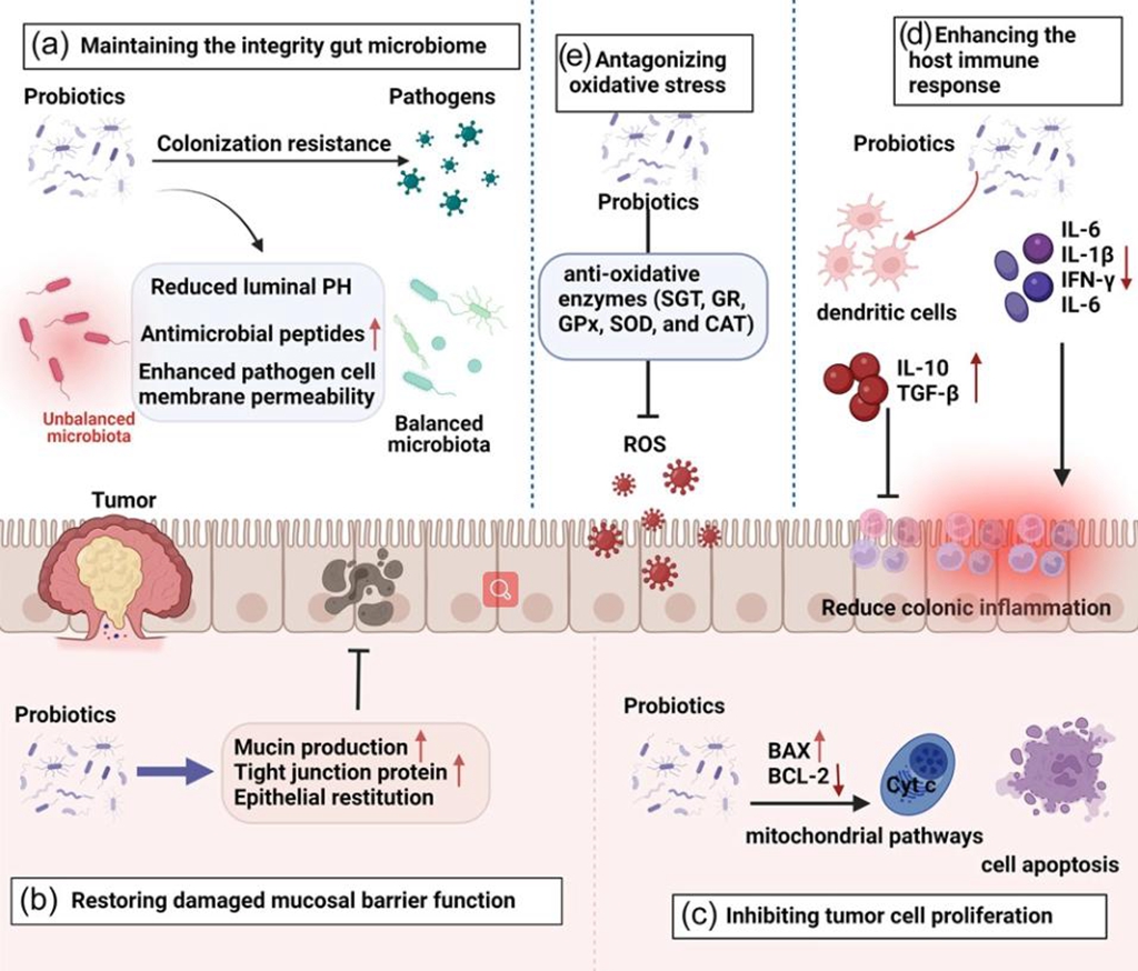 Abstract: Colorectal cancer (CRC) is the malignant tumor with the highest incidence in the digestive system, and the gut microbiome plays a crucial role in CRC tumorigenesis and therapy. The gastrointestinal tract is the organ harboring most of the microbiota in humans. Changes in the gut microbiome in CRC patients suggest possible host–microbe interactions, thereby hinting the potential tumorigenesis, which provides new perspective for preventing, diagnosing, or treating CRC. In this review, we discuss the effects of gut microbiome dysbiosis on CRC, and reveal the mechanisms by which gut microbiome dysbiosis leads to CRC. Gut microbiome modulation with the aim to reverse the established gut microbial dysbiosis is a novel strategy for the prevention and treatment of CRC. In addition, this review summarizes that probiotic antagonize CRC tumorigenesis by protecting intestinal barrier function, inhibiting cancer cell proliferation, resisting oxidative stress, and enhancing host immunity. Finally, we highlight clinical applications of the gut microbiome, such as gut microbiome analysis-based biomarker screening and prediction, and microbe modulation-based CRC prevention, treatment enhancement, and treatment side effect reduction. This review provides the reference for the clinical application of gut microbiome in the prevention and treatment of CRC.