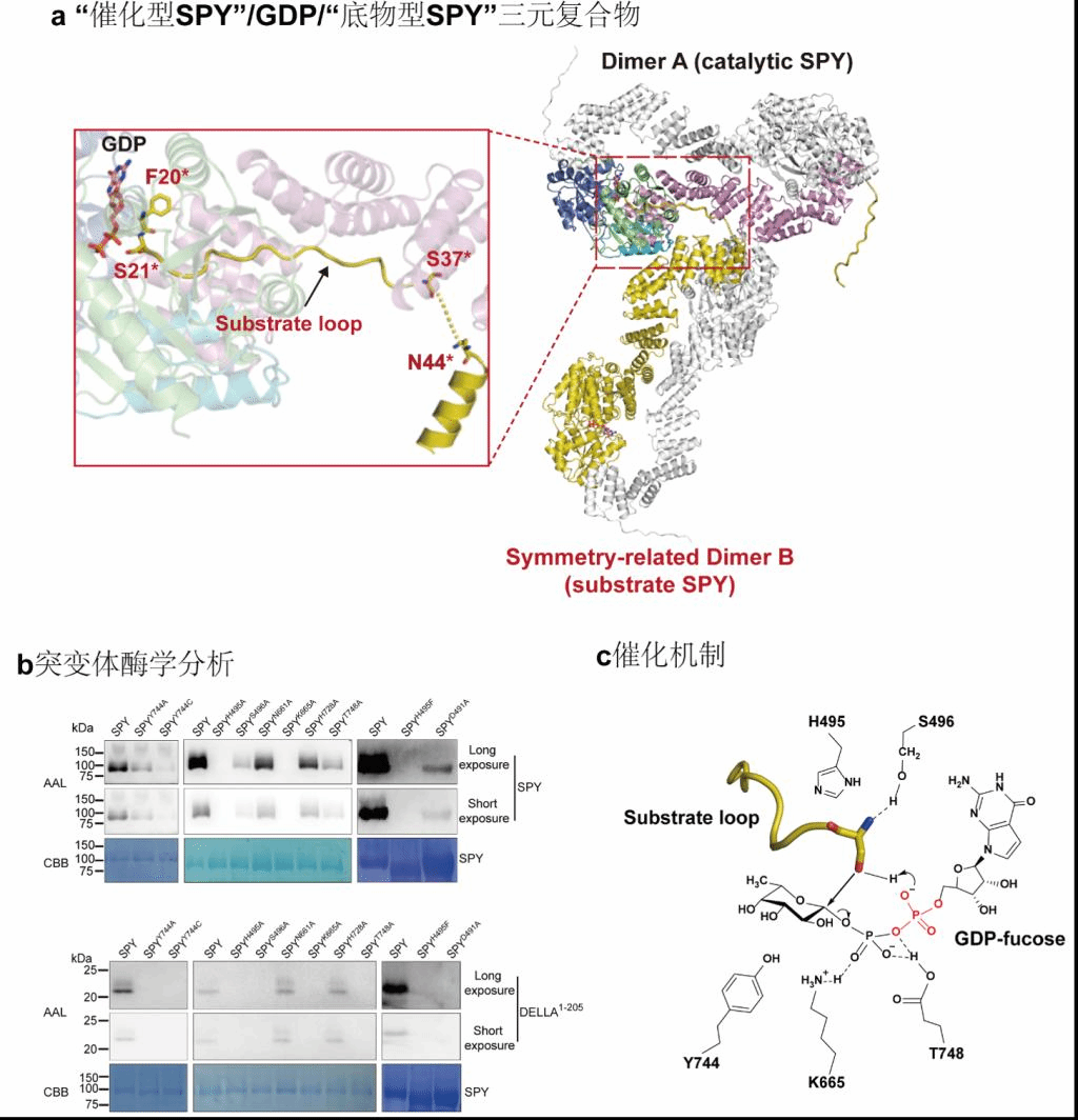 Abstract: Arabidopsis glycosyltransferase family 41 (GT41)protein SPINDLY (SPY) plays pleiotropic roles in plant development.Despite theamino acid sequence is similar to human O-GlcNAc transferase, Arabidopsis SPYhas been identified as a novel nucleocytoplasmic protein O-fucosyltransferase.SPY-like proteins extensively exist in diverse organisms, indicating thatO-fucosylation by SPY is a common way to regulate intracellular proteinfunctions. However, the details of how SPY recognizes and glycosylatessubstrates are unknown. Here, we present a crystal structure of Arabidopsis SPY/GDPcomplex at 2.85 Å resolution. SPY adopts a head-to-tail dimer.Strikingly, the conformation of a ‘catalyticSPY’/GDP/‘substrateSPY’ complex formed by two symmetry-related SPY dimers is captured in thecrystal lattice. The structure together with mutagenesis and enzymatic datademonstrate SPY can fucosylate itself and SPY’s self-fucosylation regionnegatively regulates its enzyme activity, reveal SPY’s substrate recognitionand enzyme mechanism, and provide insights into the glycan donor substrateselection in GT41 proteins.