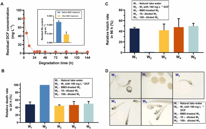 Abstract: Oxidative degradation can effectively degrade aromatic emerging contaminants (ECs). However, the degradability of lone inorganic/biogenic oxides or oxidases is typically limited when treating polycyclic ECs. Herein, we report a dual-dynamic oxidative system comprising engineered Pseudomonas and biogenic Mn oxides (BMO), which completely degrades diclofenac (DCF), a representative halogen-containing polycyclic EC. Correspondingly, recombinant Pseudomonas sp. MB04R-2 was constructed via gene deletion and chromosomal insertion of a heterologous multicopper oxidase cotA, allowing for enhanced Mn(II)-oxidizing activity and rapid formation of the BMO aggregate complex. Additionally, we characterized it as a micro/nanostructured ramsdellite (MnO2) composite using multiple-phase composition and fine structure analyses. Furthermore, using real-time quantitative polymerase chain reaction, gene knockout, and expression complementation of oxygenase genes, we demonstrated the central and associative roles of intracellular oxygenases and cytogenic/BMO-derived free radicals (FRs) in degrading DCF and determined the effects of FR excitation and quenching on the DCF degradation efficiency. Finally, after identifying the degraded intermediates of 2H-labeled DCF, we constructed the DCF metabolic pathway. In addition, we evaluated the degradation and detoxification effects of the BMO composite on DCF-containing urban lake water and on biotoxicity in zebrafish embryos. Based on our findings, we proposed a mechanism for oxidative degradation of DCF by associative oxygenases and FRs.