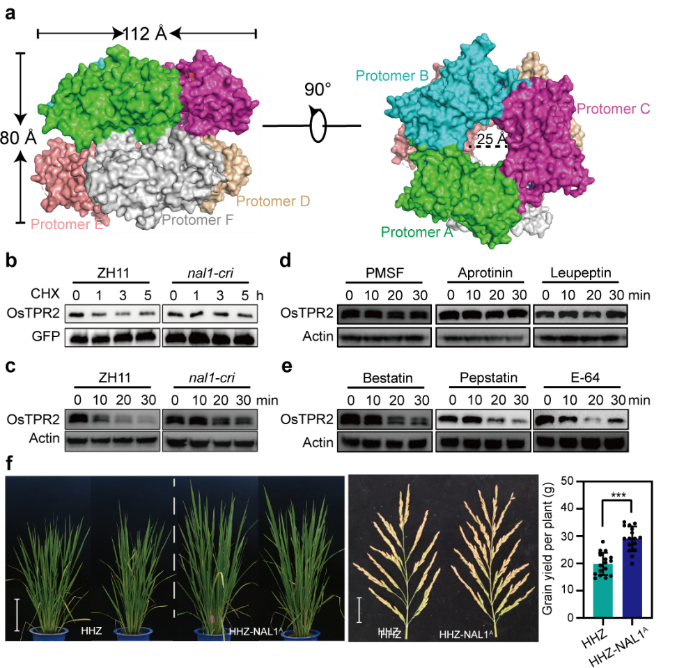 Abstract:NARROW LEAF 1 (NAL1) is a breeding-valuable pleiotropic gene that affects multiple agronomic traits in rice, although the molecular mechanism is largely unclear. Here, we report that NAL1 is a serine protease and displays a novel hexameric structure consisting of two ATP-mediated doughnut-shaped trimeric complexes. Moreover, we identified TOPLESS-related corepressor OsTPR2 involved in multiple growth and development processes as the substrate of NAL1. We found that NAL1 degraded OsTPR2, thus modulating the expression of downstream genes related to hormone signalling pathways, eventually achieving its pleiotropic physiological function. An elite allele, NAL1A, which may have originated from wild rice, could increase grain yield. Furthermore, the NAL1 homologues in different crops have a similar pleiotropic function to NAL1. Our study uncovers a NAL1–OsTPR2 regulatory module and provides gene resources for the design of high-yield crops.