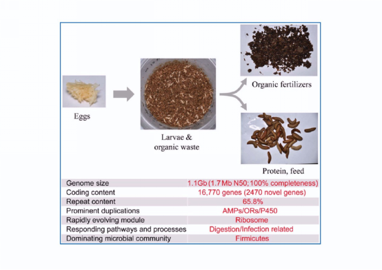 Recently, Professor Zhang Jibin’s team of the College of Life Science and Technology in Huazhong Agricultural University and Huang Yongping’s team from the Shanghai Institute of Plant Physiology, Academy of Science cooperated to perform the genome and genomic landscape for the 10-generation inbred line of black soldier fly(BSF),Hermetia illucen Wuhan strain, reveal the mechanism that BSF can efficiently convert organic wastes in harsh environment such as livestock manure by analyzing intestinal microbiome. The results were published online on November 25 in the journal Cell Research.