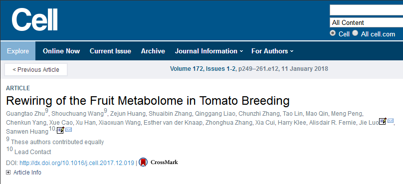 On 11st, January 2018, Cell, as one of the top international academic journals, published Prof. Jie Luo's Group from National Key Laboratory of Crop Genetic Improvement and Prof. Huang Sanwen from Shenzhen Institute of Agricultural Genomics, Chinese Academy of Agricultural Sciences on the topic of tomato breeding new Progress in research on the change of metabolome and its genetic basis.