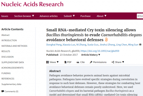 (By Chen Ling) A paper entitled “Small RNA-mediated cry toxin silencing allows Bacillus thuringiensis to evade Caenorhabditis elegans avoidance behavioral defenses”, which revealed a novel strategy of sRNA-mediated regulation to aid pathogens in combating host avoidance behavioral defenses by using Caenorhabditis elegans and its bacterial pathogen Bacillus thuringiensis as a model, was published on Nucleic Acids Research,On October 23, 2017. The work was achieved by the microbial pesticide team of State Key Laboratory of Agricultural Microbiology in HZAU. A/Prof. Peng Donghai is the first author and Prof. Sun Ming is the corresponding author.