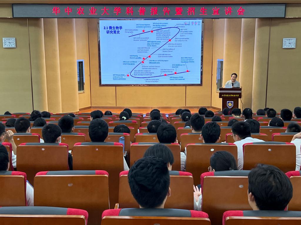 接着,从1665年开始,郑世学教授以简略风趣的语言向同学们讲述了微生物学跨越五个世纪的漫长故事。细菌病毒的发现、抗生素的发现、基因技术的广泛应用等等众多研究故事,教授都娓娓道来。他告诉同学们,微生物的研究为生命科学基本规律的发现奠定了重要的基础,不仅如此,微生物也已经以各种形式融入到了我们生活的方方面面。同学们从益生菌制剂、发酵罐、平皿画等图片和教授的讲述中,看到了微生物在生产、环境保护、疾病与治疗以及艺术等领域中的作用。